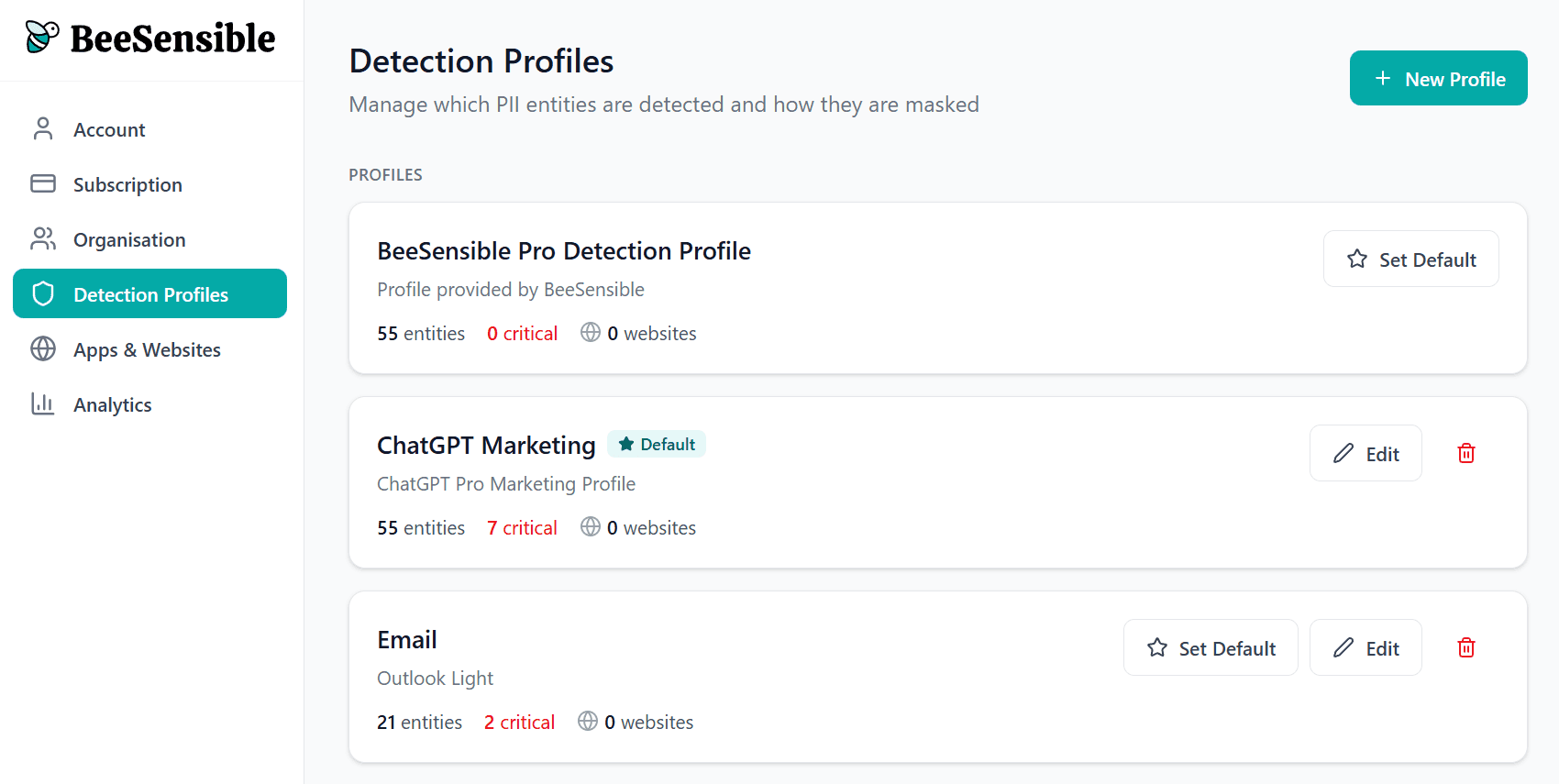 A detection profile defines which data types BeeSensible recognizes and how sensitive each one is.